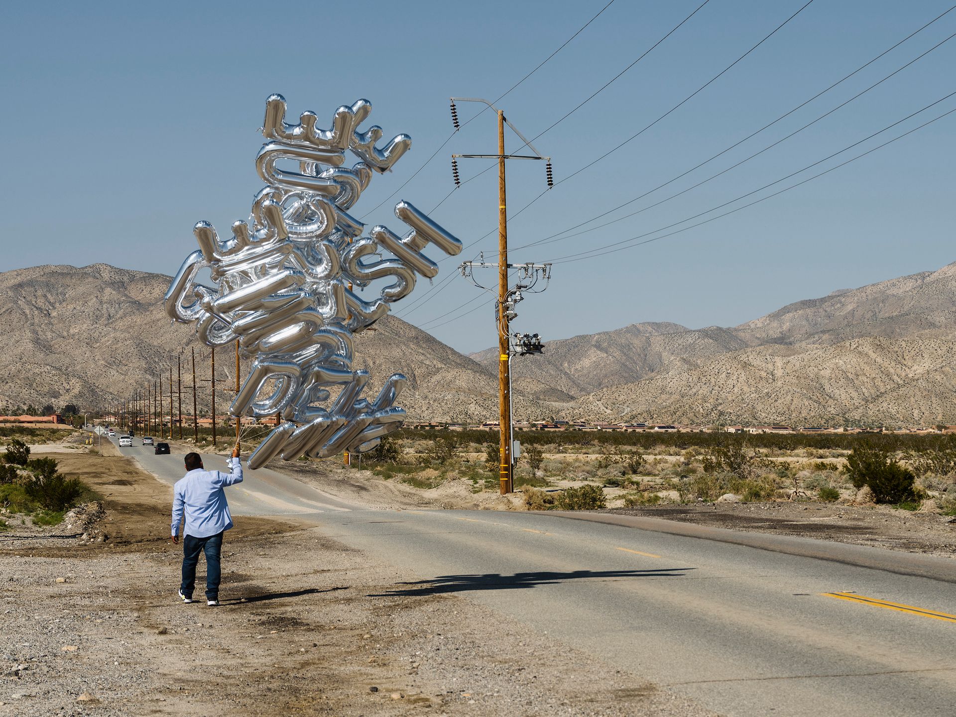 Chimera (2023) by the Mexican installation artist Héctor Zamora was an action staged during the exhibition’s opening weekend. Street vendors were hired to walk the streets of the town of Desert Hot Springs holding bundles of inflatable silver letters that spelled words such as “dream”, “denied” and “mirror”. While providing a moment of delight for passersby, they were also meant to provoke questions. “It’s far more political than it looks,” Campbell says. “They’re words that are relevant to the migrant experience.”